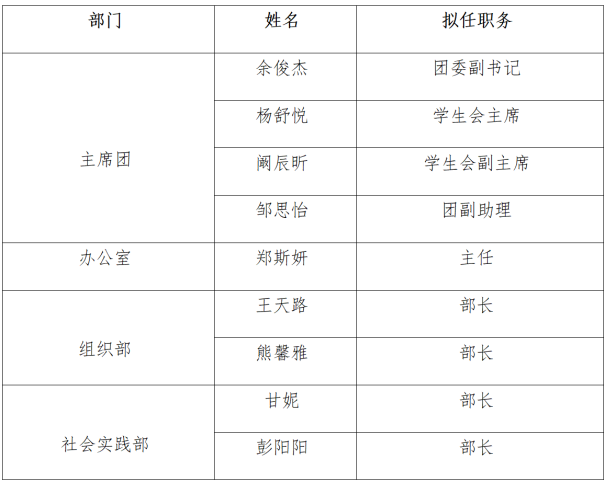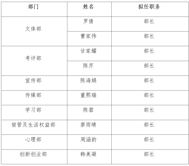 根据《湖北科技学院2025-2026 学年度亚洲必赢学生干部换届工作实施方案》,经个人申请、院部推荐、公平竞选、民主评议、亚洲必赢综合各方意见研究决定,拟聘任以下同学担任2025-2026学年度亚洲必赢团委学生会部门负责人: