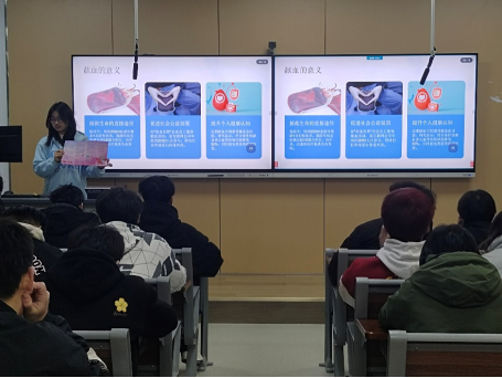 随后,班会转向“热血传递爱”无偿献血知识普及。一袋血,或许只是一次简单的捐献,却可能成为他人生命的希望。班会详细讲解了献血的意义:它是临床救治的重要保障,每200毫升血液就能为一名创伤患者争取生机;它也是一项温暖的公益行动,承载着“人人为我,我为人人”的互助精神。对于献血的条件、流程、注意事项,班会也作了细致说明——从年龄体重要求、健康状况评估,到献血前后的饮食休息、护理要点,让同学们科学认识献血,消除顾虑。不少班级还介绍了用血减免政策,包括本人及亲属的用血优惠,让爱心有回响、善意可延续。